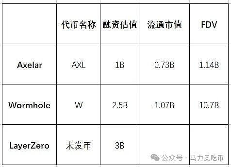 从币价潜力来看,我认为更加值得关注Axelar。Wormhole的各项数据都要比Axelar差一些,FDV却是Axelar的10倍左右。而LayerZero的真实数据尚不可知,但是融资估值已经高到3B,上所后可能也将达到10B,也是10倍于Axelar。