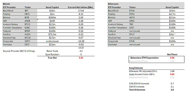 就我个人而言,我认为以太坊流量可能是比特币的 15%。从比特币 50 亿美元的真实净购买量(上文提到)开始计算,通过调整以太坊市值(占比特币的 33%)和 0.5 的⎡访问系数⎦,我们可以得出 8.4 亿美元的真实净购买量和 25.2 亿美元的报告净购买量。有一些合理的论据表明,ETHE (灰度以太坊期货 ETF)的溢价比 GBTC 要少,所以我认为乐观的情况是 15 亿美元的真实净购买量和 45 亿美元的报告净购买量。这大约占比特币流量的 30%。