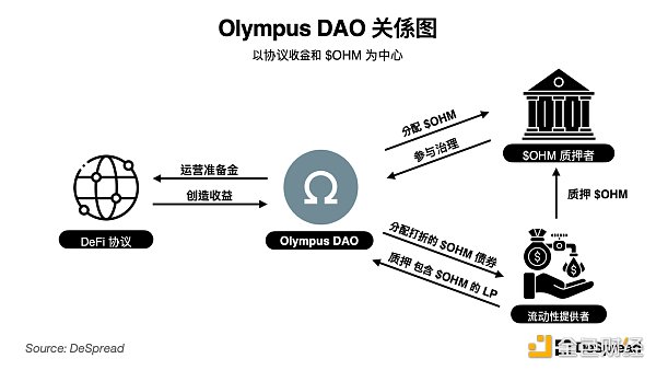 用户可以存入由单一资产(如以太坊、稳定币或 OHM-资产对组成的 LP 代币),并获得折价的 OHM 债券作为回报,Olympus DAO 将通过治理来管理这些资产,从而获得收益。
