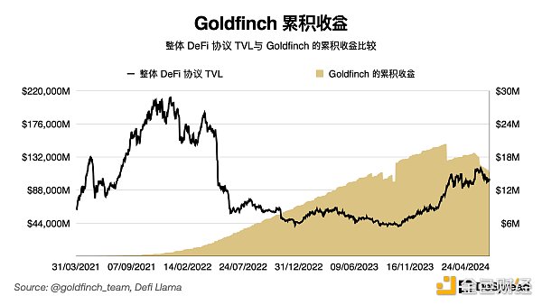 上线初期,Goldfinch 通过流动性挖矿分发其治理代币 $GFI,筹集了大量流动性,即使在流动性挖矿活动结束和 Luna-Terra 事件后市场进入低迷的情况下,Goldfinch 仍能从外部来源获得稳定的净收入,为流动性提供者提供约为 8% 的稳定预期利率。