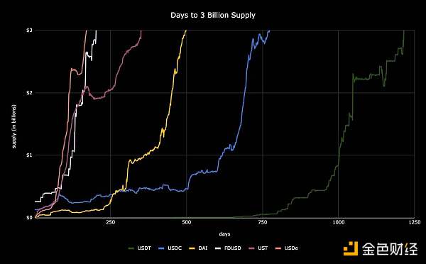 稳定币达到 30 亿美元市值花费的时间,来源:@leptokurtic_的推特