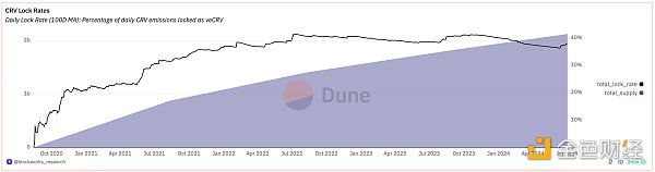 在这些效应的作用下,$CRV 代币的锁定比率迅速增长,在一年半内达到 40%,并一直保持至今。