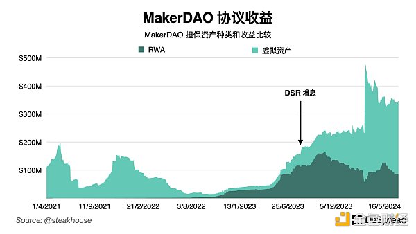 也是因为如此,在 2023 年,儘管当整个 DeFi 生态系统经历熊市时,MakerDAO 的 RWA 担保资产能够持续产生稳定的收益,占了协议总收益的 70%。而基于这些收益,MakerDAO 得以将 DSR 的利率从 1%提高并维持在 5%,从而有效支持了对 $DAI 的需求。