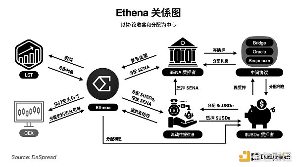用户在 Ethena 上存入的资产通过场外结算 (OES, Off-Exchange Settlement) 提供商以 $BTC、$ETH、能够获取利息的以太坊 LST 代币和 $USDT 的形式进行分配。随后 Ethena 通过在 CEX 上开立相当于其持有的 $BTC 和 $ETH 现货抵押资产的空头头寸进行套期保值,以保持对于持有资产的 Delta 中性状态。