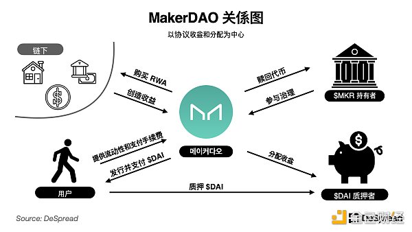 通过这种方式,MakerDAO 从以链上资产为担保发行稳定币的协议为开始,通过与现实世界金融接洽,实现了收入来源的多样化,加强了与实体经济的联系。这确保了协议的可持续性和长期增长,使 MakerDAO 成为领先的 RWA 协议,为传统金融与 DeFi 的融合指明了新方向。