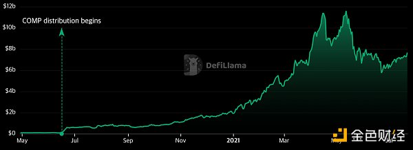 随后,在 2020 年 6 月,最具代表的借贷协议 Compound推出了流动性挖矿 (Liquidity Mining)活动,在比特币减半前后吸引市场上的流动性,通过发行治理代币 $COMP 并将其分配给流动性提供者和借贷者,引起了 Compound 上出现大量流动性和借贷需求。