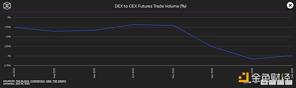 CEX 与 DEX 的期货交易量比较, 来源: The Block