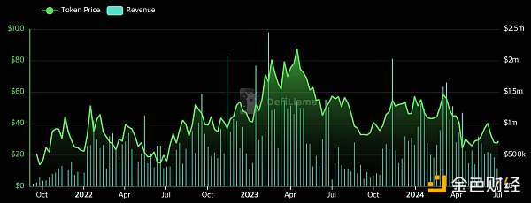 GMX 协议收益以及代币价格趋势, 来源: Defi Llama