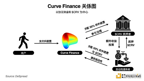 - 持有 $veCRV 的用户可以从 Curve Finance 产生的交易费用中获得 50% 的收益,并通过参与流动性池的投票,进一步提高流动性挖矿的奖励。