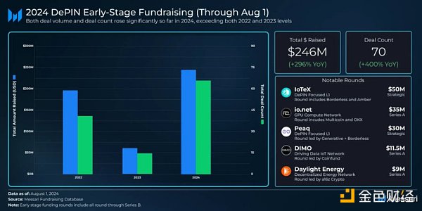 2024年最大的三笔融资中,有两笔投向了针对DePIN量身定制的L1,其中包括IoTeX和Peaq,前者成功融资5000万美元,后者3000万美元。