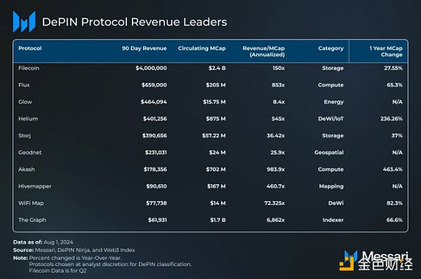 然而,市值的增长与收入的增长并没有什么关联。所有的DePIN协议收入都很低,只有最大的四个DePIN协议跻身收入榜单前8名。