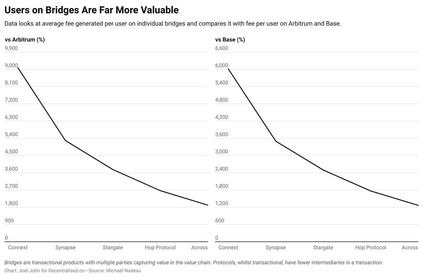 有趣的是,当我们将协议上捕获的价值与跨链桥的价值进行比较时。