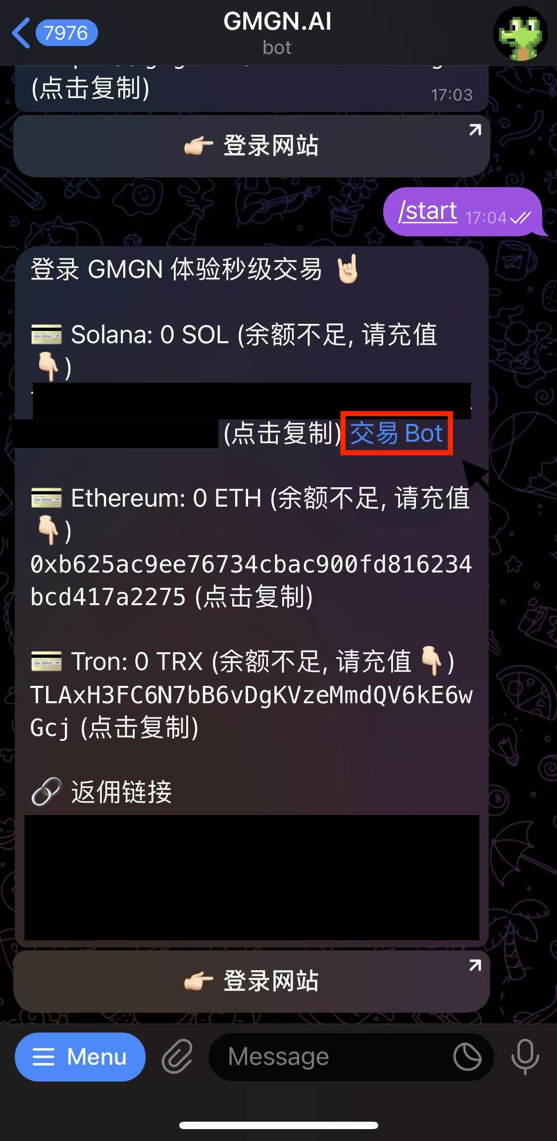 此处登陆 GMGN 钱包机器人。当转到以下页面时就算登录成功了,如下图,GMGN 会自动为用户生成 Solana、以太坊和 tron 的钱包地址。如果要交易 Solana Meme 币,用户需要从交易所或者链上为 Solana 地址转账,转账操作具体就不演示了。