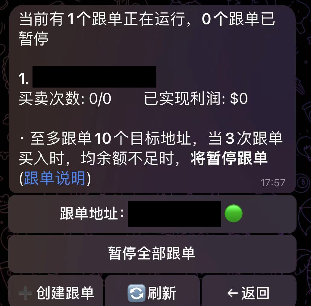 如果返回再次点击“钱包跟单”,便能清晰的看见跟单运行情况,但无法查看具体跟买/卖了哪些 Meme 币。