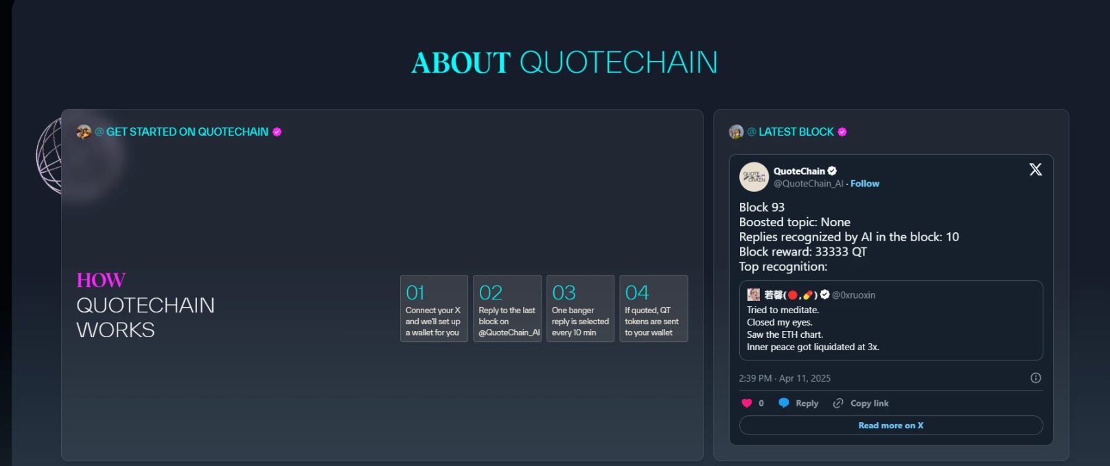 每一个「区块周期」由官方账号 @QuoteChain_AI 发出一条引用推文;