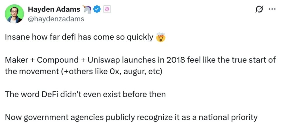 DeFi 发展得如此之快,真是不可思议🤯。就在 2018 年,MakerDAO Compound Uniswap 的上线,感觉像是 DeFi 运动的真正开端。在那之前,「DeFi」这个词甚至都不存在。7 年后的现在,政府机构公开承认它是国家优先事项!