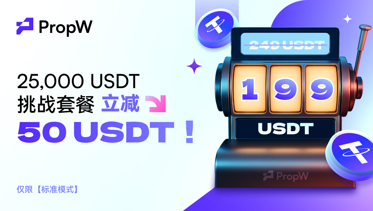 每一次突破,PropW与你同行!我们重磅推出限时折扣活动。这一次,我们带来前所未有的挑战升级:购买 25,000 USDT 挑战套餐,立减 50 USDT,仅需 199 USDT 即可开启挑战!