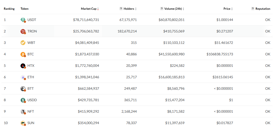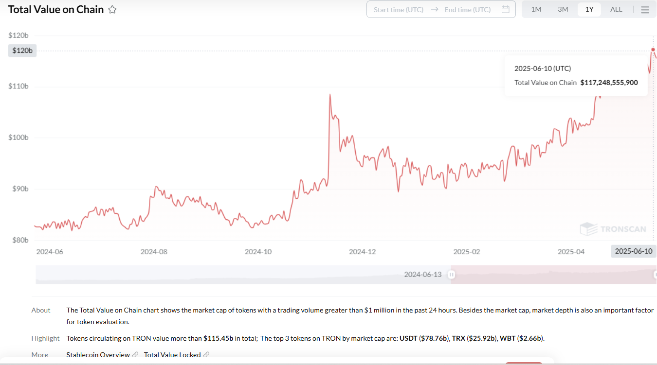 根据TRONScan浏览器,截至6月13日,波场TRON网络中资产流通总价值(TVC)约1155万亿美元,较去年同期的820亿美元实现了40%的显著增长。其中,在波场TRON网络中流通价值排名前三的资产分别为USDT(约788亿美元)、TRX(约259亿美元)、WBT(约26.6亿美元),BTC、ETH紧随其后。此外,还有WBT、HTX、USDD、BTT、NFT及TUSD等波场TRON生态项目资产,涵盖领域广泛,共同构建起丰富且多层次的价值体系,更加多元化。