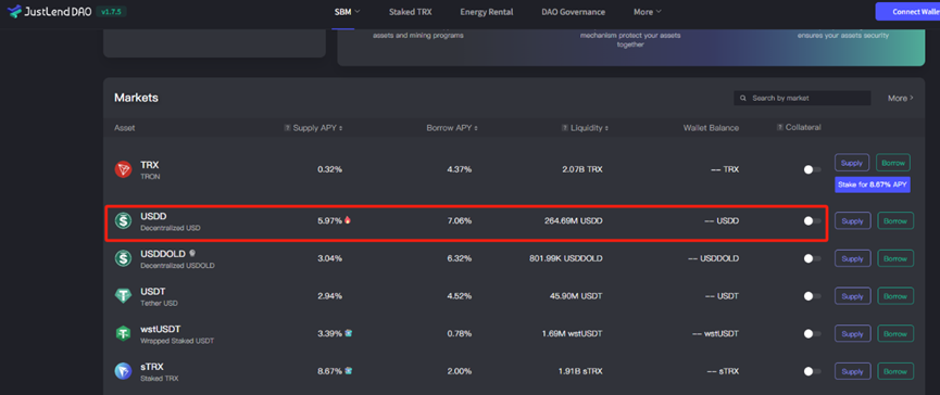 此外,目前用户在JustLend DAO平台,除了通过提供资产赚取利息外,还可以通过存储USDD获得额外奖励收益。USDD是由JustLend DAO的子DAO—GrantsDAO联合TRON DAO 储备库共同发起的去中心化稳定币。今年1月,USDD升级为USDD 2.0版本。同期,JustLendDAO上线了USDD借贷服务功能,用户可通过存储USDD赚取收益,当前收益为约6%。截至6月16日,该资金池已有高达2.64亿的USDD。