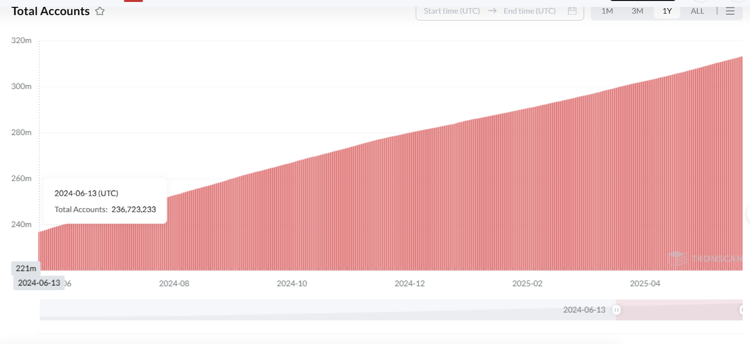 值得一提的是,波场TRON链上地址账户增长态势呈现出稳定的线性轨迹,回溯至1年前的同一天,链上账户总数约有2.37亿个,而如今已实现超32%的跨越式增长,日均新增账户数约21万个。这一数据不仅有力印证了波场TRON网络用户基础的持续扩张,更彰显出其生态系统在全球范围内的广泛吸引力与强大的市场渗透力,成功吸引了全球海量用户,为生态系统的持续繁荣筑牢根基。
