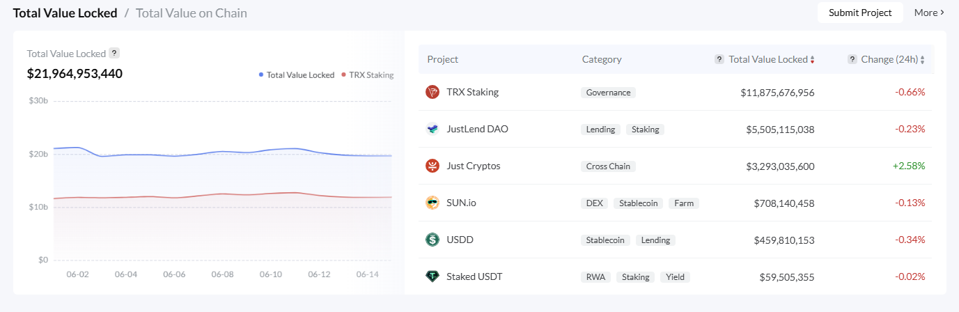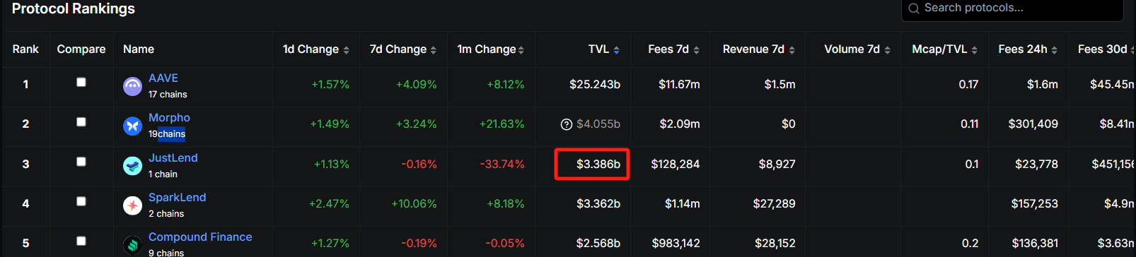 根据DeFiLama数据显示,6月16日,JustLend平台上TVL高达约34亿美元,在整个借贷赛道市场排名位居前三。
