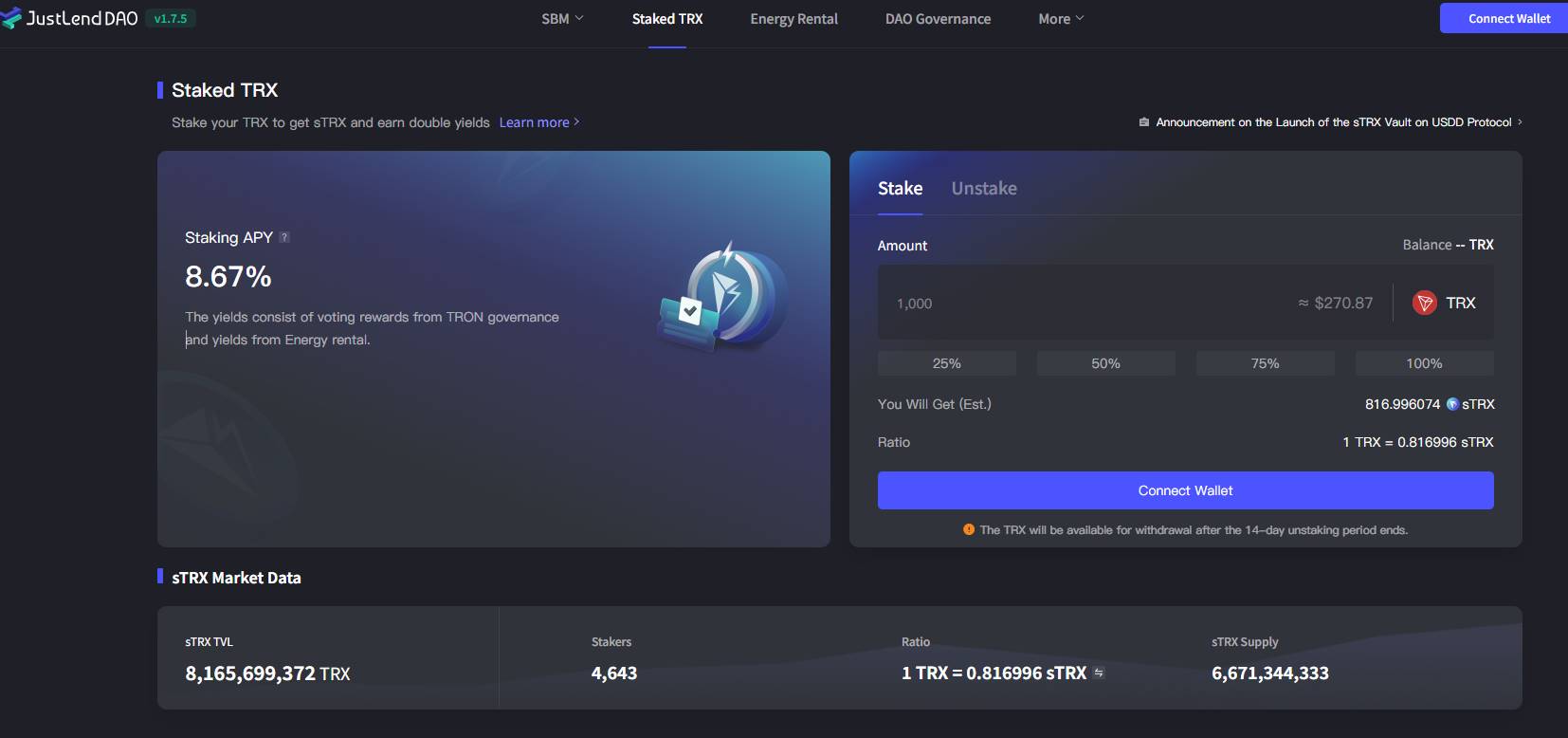 ● sTRX(Stake TRX)是基于波场TRON的流动性质押产品,sTRX 为用户提供了更高的收益回报,同时具备更灵活的解除质押选项,让用户在享受质押收益的同时,能够根据自身需求灵活调整资产配置。