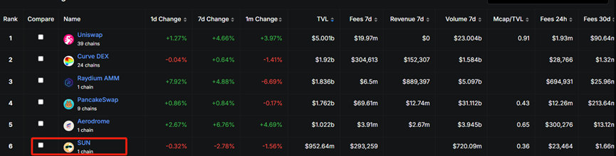 从数据层面来看,SUN.io的表现非常优异。根据DeFiLlama数据显示,6月16日,SUN.io平台锁仓的加密资产价值(TVL)超过9.52亿美元,这一数字在波场TRON网络长期位居前三之列,在整个DEX赛道中也排名前六。