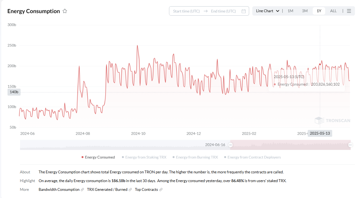 官方浏览器数据显示,近一年内,能量(Energy)消耗规模从初始的800多亿激增至1900亿,增幅高达240%。这一飙升的数据不仅直观展现了网络交易活跃度的爆发式增长,更从侧面印证了能量消耗与用户真实交易需求呈强正相关关系。能量需求越高,意味着链上转账、合约调用等交易活动越频繁,凸显了波场TRON网络生态的繁荣态势与用户参与的深度广度。