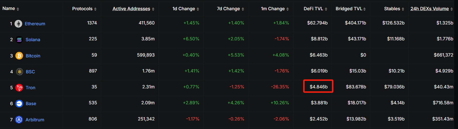 据DeFiLlama数据,6月16日,波场TRON生态内的DeFi应用总锁仓价值(TVL)高达48.4亿美元,活跃地址数在230万以上,稳定币资产规模逼近800亿美元,其TVL长期位居整个公链市场前五名。