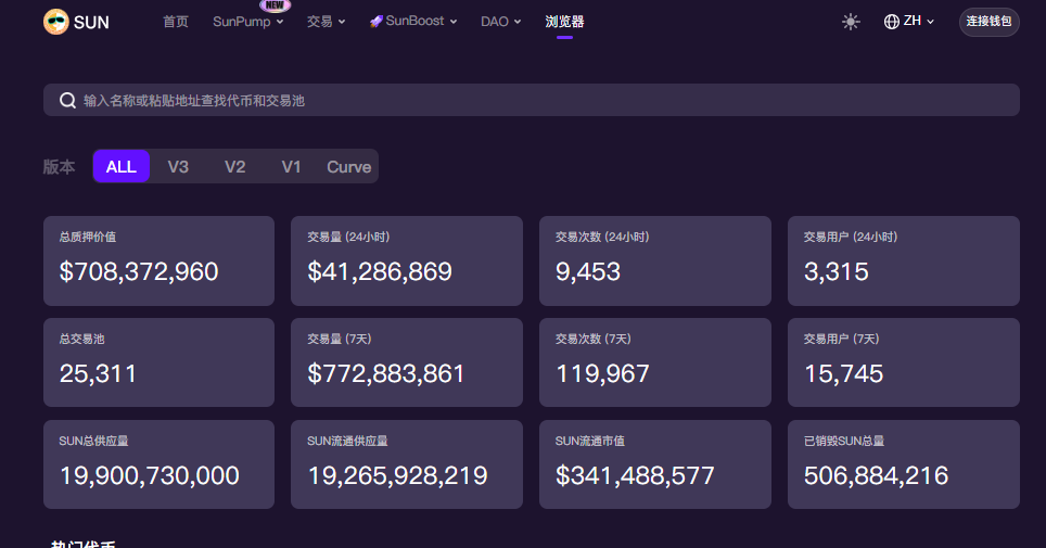 ● SunSwap(交易核心引擎):是基于AMM机制的交易平台,历经V1、V2、V3三个版本的升级迭代,当前交易主要发生在V3板块中。