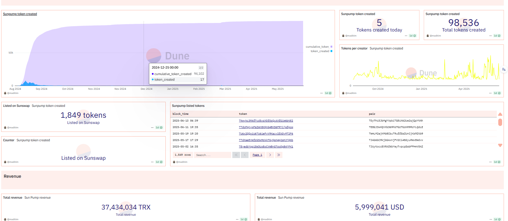 根据Dune数据显示,截至6月16日,SunPump平台已创建的Token数量已超过9.8万个,上线Sunswap的Token数量约1850个。协议上线以来累计捕获的收益已突破1000万美元。这一系列亮眼的数据,无疑是SunPump平台蓬勃发展的有力见证。