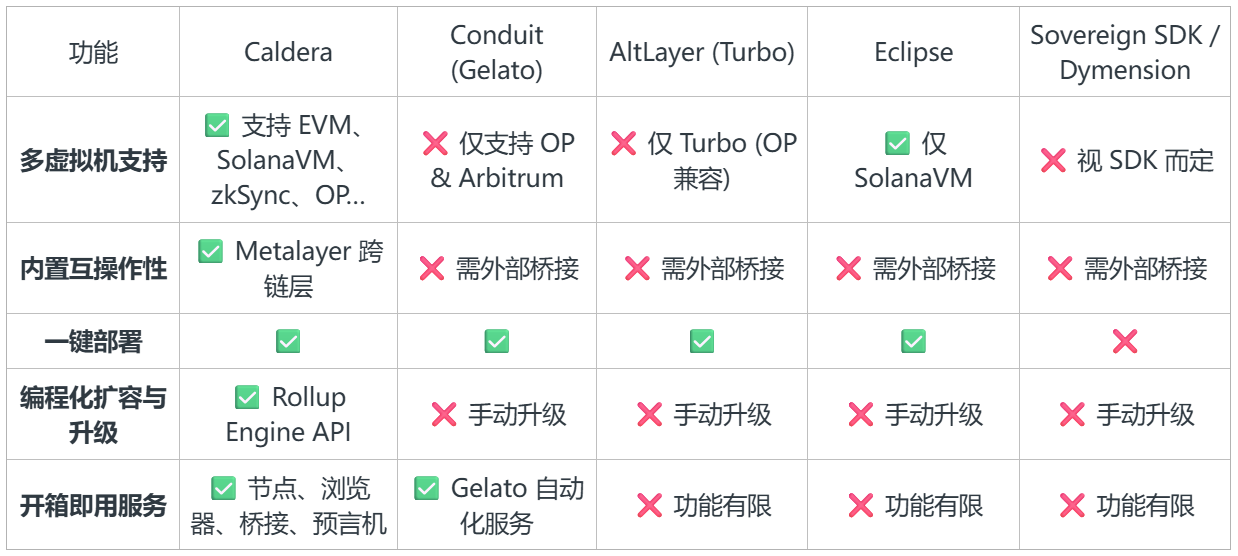 随着对一站式 Layer-2 解决方案需求的增长,多家平台进入了 Rollup-as-a-Service(RaaS)赛道。以下是 Caldera 与主要竞品的对比: