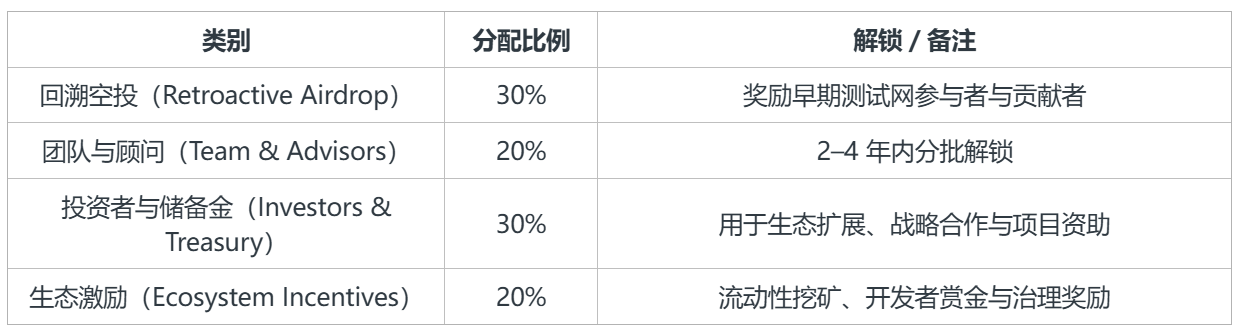 - 团队与顾问(≈20%):份额将在两至四年内按期解锁,确保核心成员持续投入。