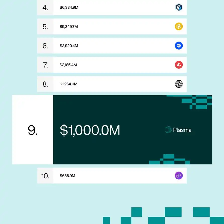 在主网测试版发布时,Plasma 将以稳定币流动性位居全球第九大区块链,价值 10 亿美元
