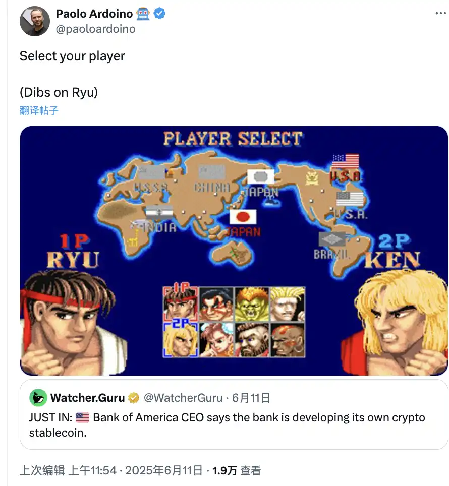 上周,Paolo 把美国第一家明确表态愿意发行稳定币的大银行新闻转发到 X,并配了句意味深长的「Select your player」。业内立刻猜测,Tether 很可能与在这家银行合作。