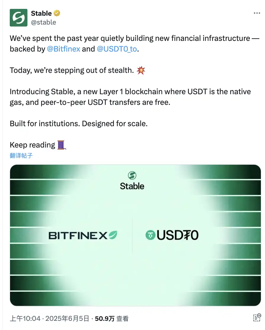 Plasma 把这些链上的大户流动性和开发者生态揽进怀里之后,Tether 并没有就此止步。这个月 由 Bitfinex 和 USDT 统一流动性协议 USDT0 支持的一条 L1 链 Stable 官宣了,Tether 首席执行官 Paolo Ardoino 为该项目顾问。