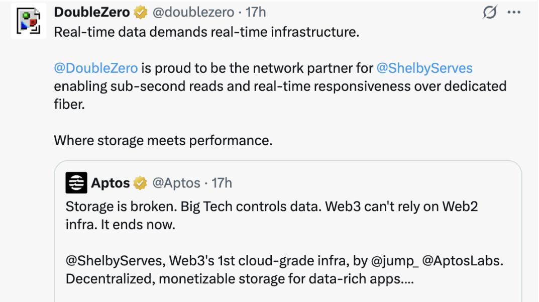 Metaplex 扎根于 Solana,而 DoubleZero 更是由 Solana 前策略负责人 Austin Federa 创立。Jump 深度参与的 Solana 生态项目也来参与 Aptos 生态建设,是否说明 Shelby 背后真的「有点东西」,得到了大家的认可?