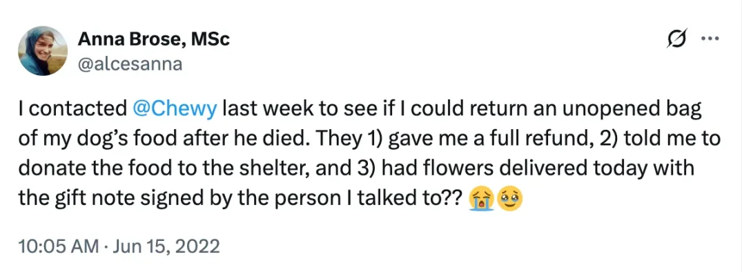 早期的执行过程井然有序,并且以客户为中心。Chewy 的客服团队不仅处理订单,还会寄送手写的节日贺卡,为忠实客户定制宠物肖像,并在心爱的宠物去世时送上鲜花。这些服务需要花钱,而且难以规模化推广。以下是一条广为流传的推文: