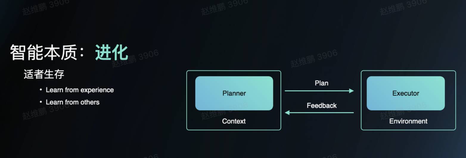 所以,这就是 Agent 的 Planner 和 Executor 这个循环迭代的事情。如果你投入足够清晰,你能让智能产生智能,我认为你是可以参与整个 AGI 的过程的。