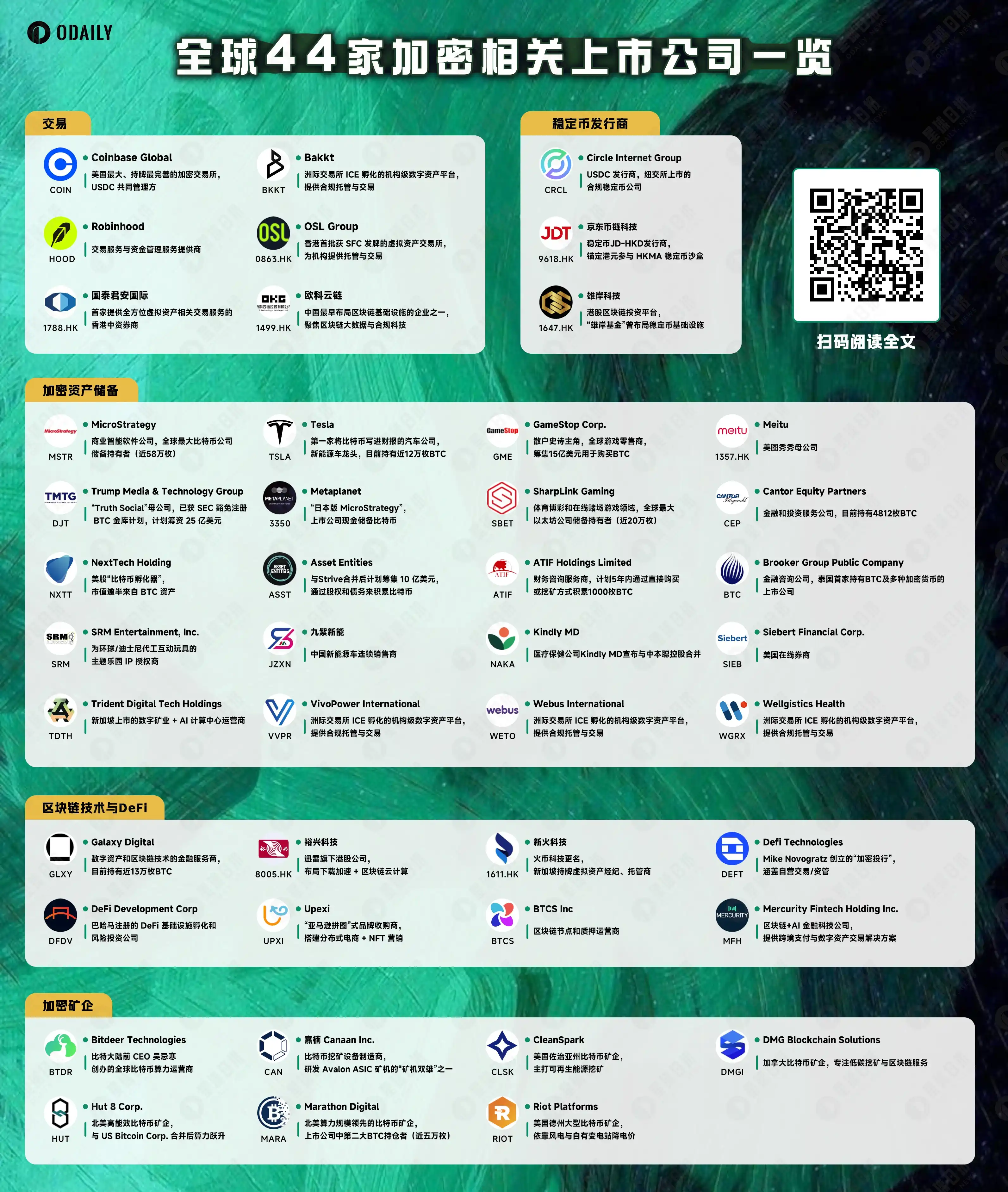 这股热潮背后,蕴藏着怎样的资本逻辑与演进趋势?为拨开迷雾,Odaily 星球日报深度扫描全球 44 家代表性上市公司,并依据其核心加密业务属性,提炼五大关键赛道: