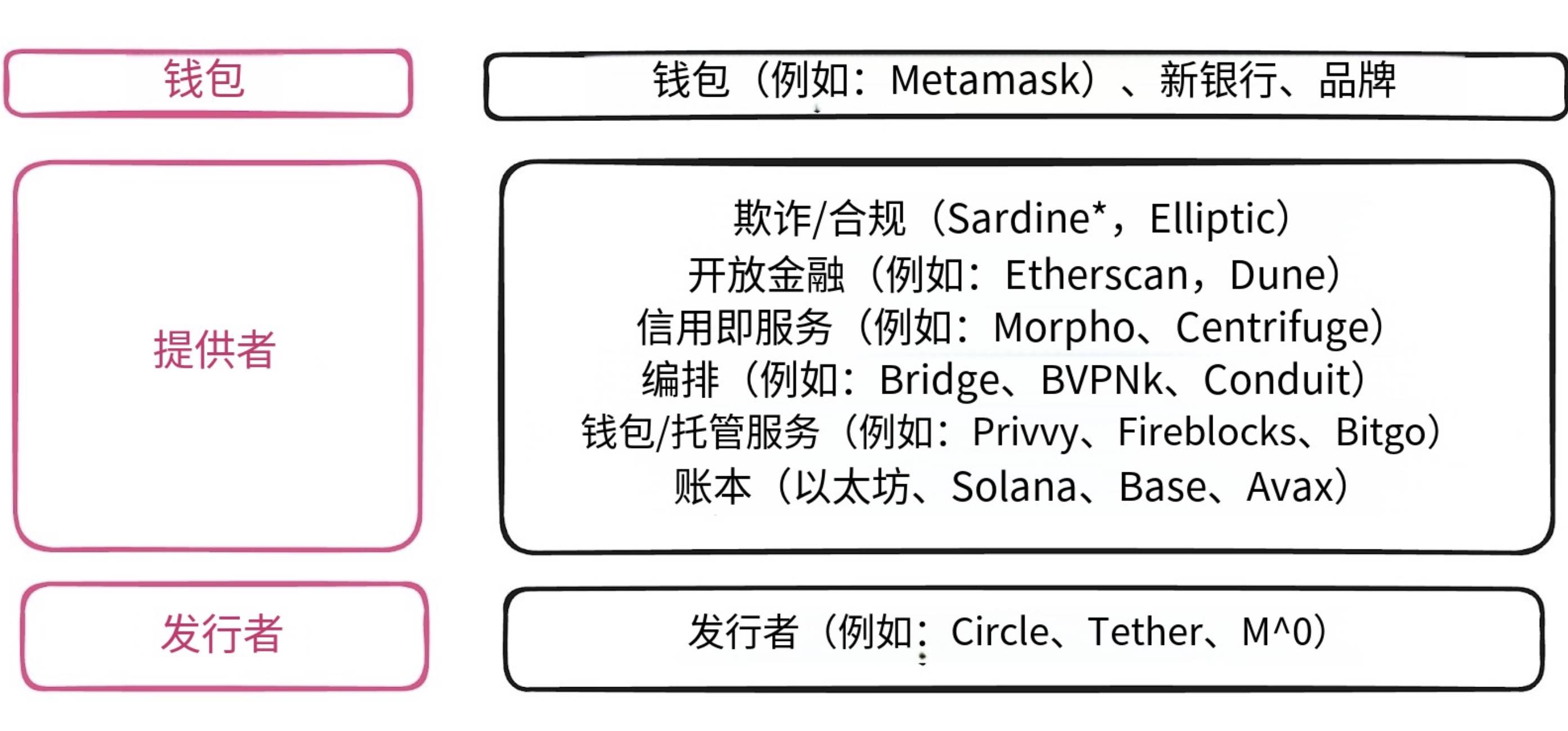 托管服务和钱包是稳定币生态中的安全核心。自托管钱包允许企业或个人管理自己的稳定币和资产。像 Privvy 或 Fireblocks 的“钱包即服务”(Wallet-as-a-service)这样的解决方案非常有趣,因为它们将这项能力以无头服务(headless service)的形式提供。作为企业,你可以像保管现金一样持有稳定币,只不过这个“保险库”是通过 API 雇佣的。这样,你可以避免直接参与加密资金流,而用户也能享受到稳定币的所有好处,甚至无需知道他们正在使用稳定币。不过,在这种自托管模式下,你需要承担保管私钥的潜在风险。