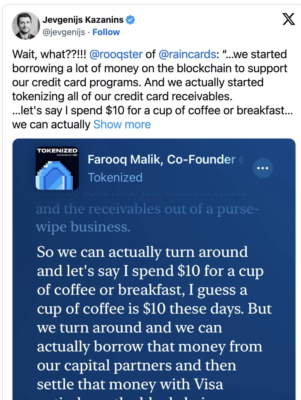 作为一个非银行的信用卡项目,你可以让客户刷卡时,资金直接从你的信用额度中提取,并即时通过 Visa 结算。你还可以将客户的还款与借款人的还款直接链接——一切全自动化。正如 Rain 的 CEO 在最近的 Tokenized 播客中所解释的那样: