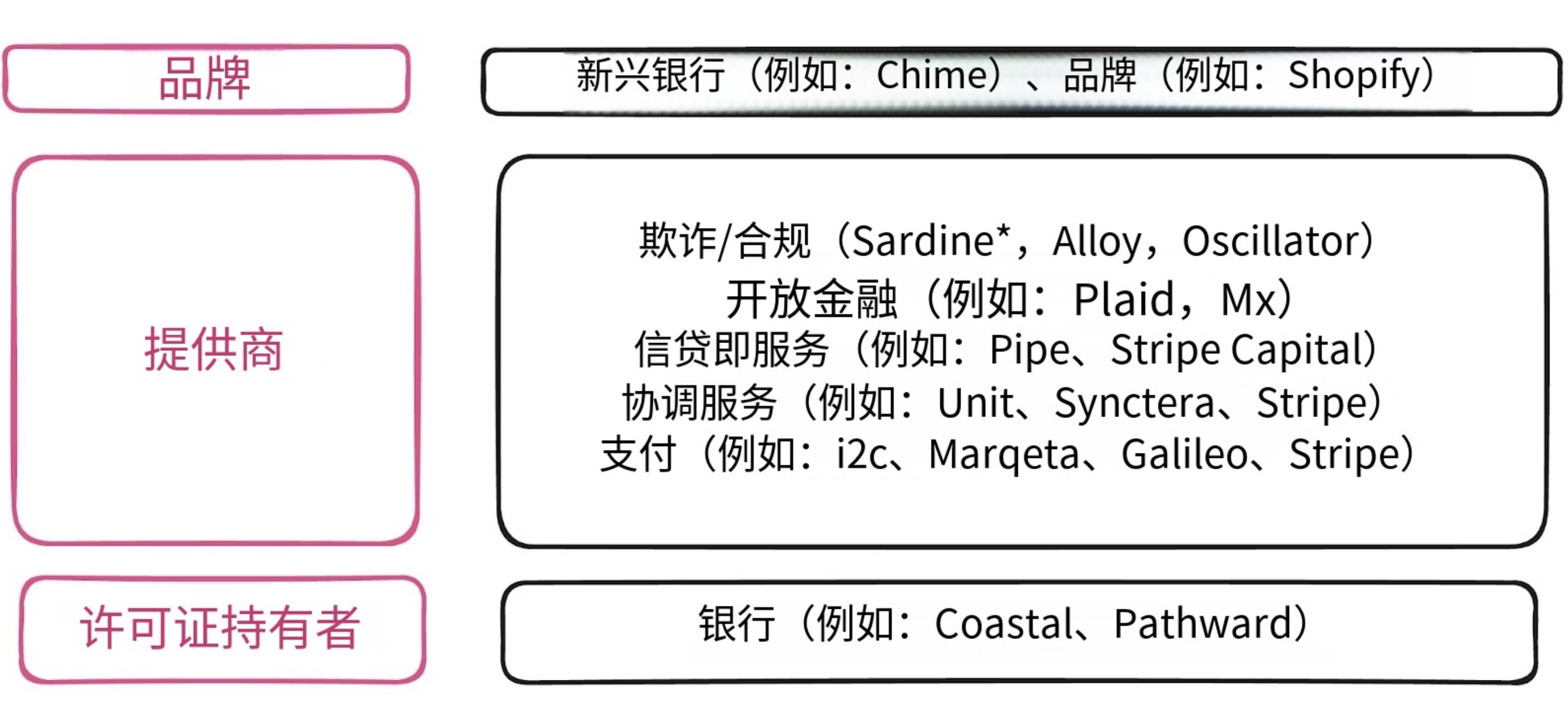实现这一点仍然需要接入银行和支付的“轨道”,例如信用卡、ACH(自动清算中心)和电汇。这为较小的银行提供了机会,它们通过与第三方(如新型银行 Neobank)合作来“出租”自己的牌照。这些新型银行和非银行机构随后通过 API 提供商组装面向客户的产品。