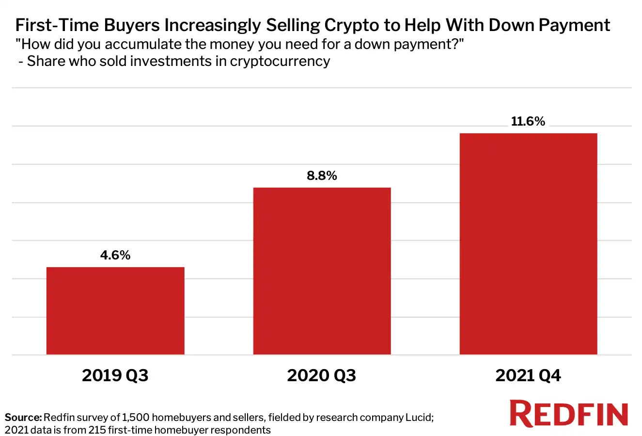 美国房地产经纪公司 Redfin 的首席经济学家 Daryl Fairweather 表示「由于时间充裕,又缺乏令人兴奋的消费方式,疫情期间许多人开始交易加密货币。其中一些投资化为泡影,但同时也使一部分人获得大量财富,或至少获得了足以支付房屋首付的水平。」