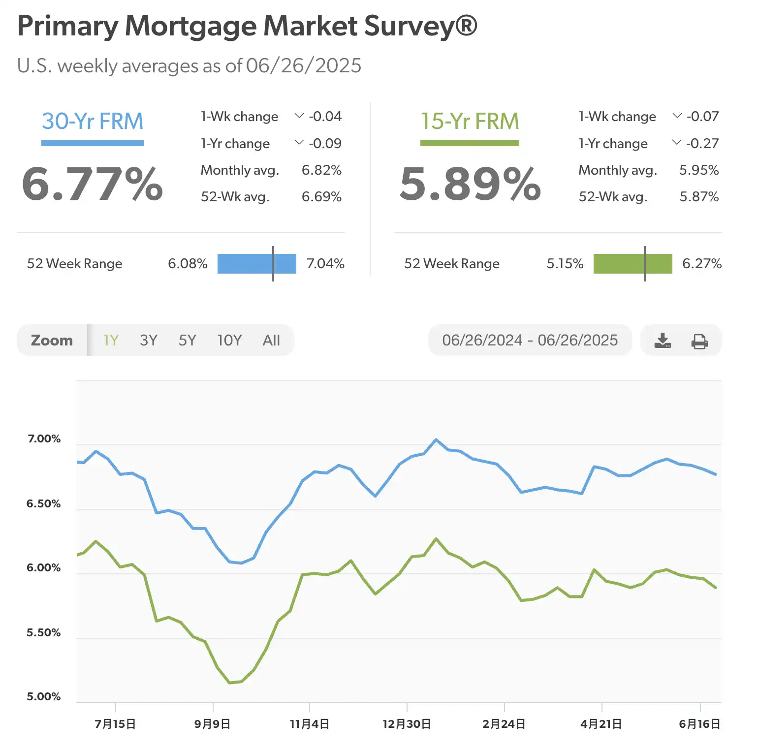 根据房地美提供的数据来看,当前美国 30 年期的抵押贷款年利率普遍在 7 % 左右浮动,而 15 年期的则在 6% 左右浮动。