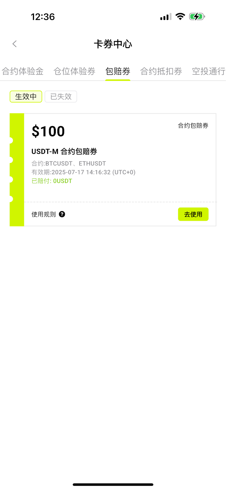 用户需在卡券的有效期内参与 BTC/USDT 或 ETH/USDT 合约交易;
