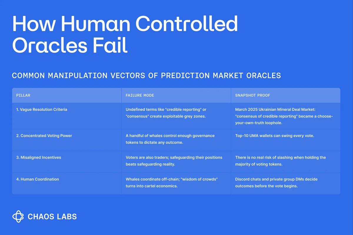 这个问题远远超出了 Polymarket 和 UMA 的范围。人为控制的预言机容易受到各种操纵和激励设计陷阱的影响。