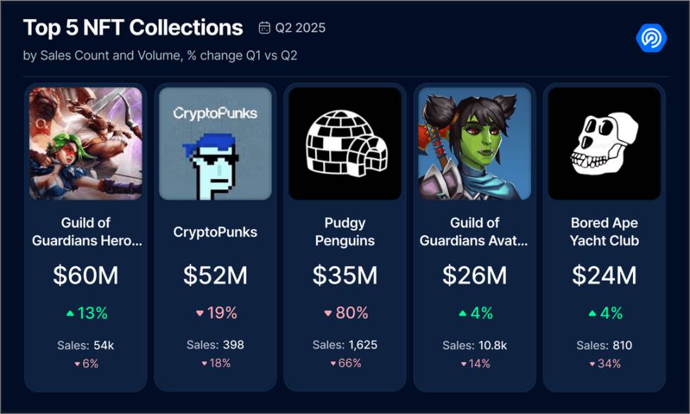 经过相当长一段时间(可能是几年来),一个游戏 NFT 合集首次在季度交易额中登顶榜单。Guild of Guardians 不仅跻身前五,更一举占据两席位置,超越了 CryptoPunks 和无聊猿等蓝筹项目。这印证了我们观察到的整体趋势:第二季度 NFT 市场活动主要由 RWA 和游戏资产推动。如今,我们终于有了支撑这一论断的数据依据。
