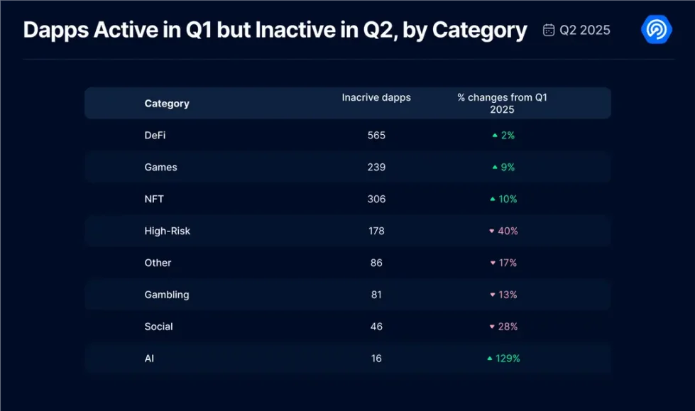 此外,另一个值得关注的视角是:本季度我们新增了"休眠 Dapp"指标,具体追踪那些在 2025 年第一季度活跃、但在第二季度完全停止活动的去中心化应用。