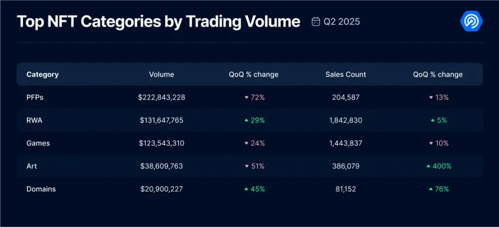 3.NFT 销售额暴增 78%、交易量却下滑:RWA 与游戏引领市场转变